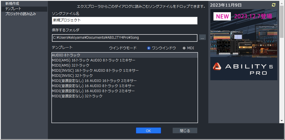 新規作成するプロジェクトファイルのトラック構成のカスタマイズやテンプレートの選択、作成済みプロジェクトの読み込みなど楽曲制作のスタートを支援。