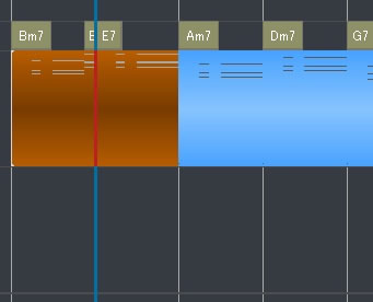 MIDIフレーズデータをAUDIOフレーズ(ACIDファイル)同様のループ(繰り返し)操作で伴奏作成が行え、指定したコード進行のタイプやオンベース、テンション、テンポを反映して展開されます。
