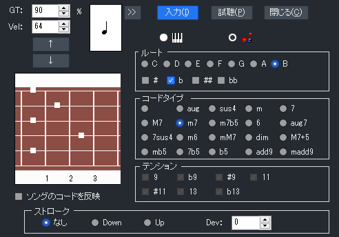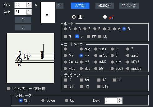 コードのルート、16種類のコードタイプ、テンションを指定して和音を入力可能。