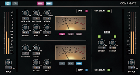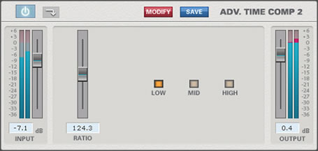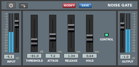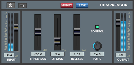 THRESHOLD値を下回る信号を圧縮してTHRESHOLD値を上回る信号を強調しダイナミックレンジを広げます。THRESHOLD値を下げ、Ratioを最大にするとノイズゲートとしても使用できます。