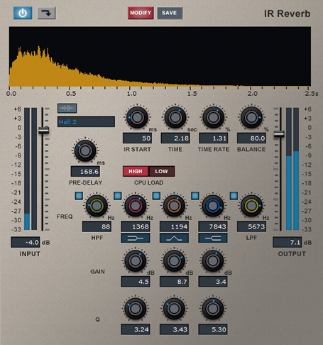 コンボリューション(畳み込み演算)リバーブエフェクトです。実際のホールなどの反響特性のインパルスレスポンス(IR)データを元に、畳み込み演算でリアルに残響を再現します。また、EQセクションで、コンボリューションリバーブにEQをかけることができます。