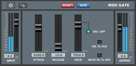 MIDIノート情報のON/OFF を使用してオーディオ信号にゲートをかけます。設定するTHRESHOLD値を上回る信号を強調します。THRESHOLD値を極端に下げるとノイズゲートとしても使用できます。