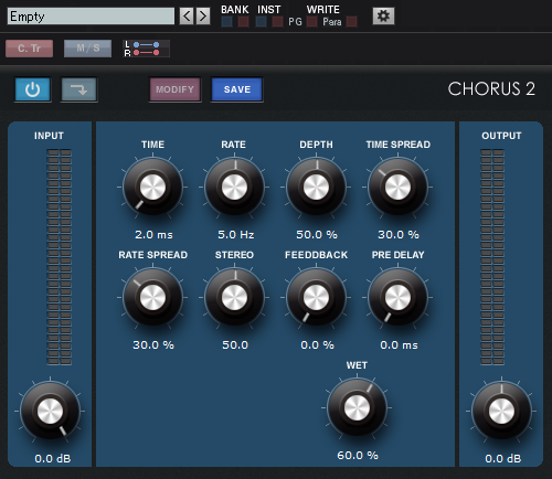 長いディレイタイムでコーラス、短いディレイタムの設定でフランジャーの効果を与えます。