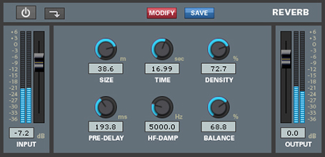 サウンドに残響効果(リバーブ)をプラスして、空間の大きさをシミュレートします。リバーブ音にEQをかけることができます。