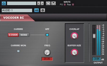 サイドチェインまたは、ホワイトノイズをキャリアにするボコーダー。サイドチェインには、VSTiやオーディオトラックに入力したオーディオ信号をアサインでき、ボコーダーサウンドを作り出します。また、キャリアにノイズを設定し、ボーカルトラックに使用するとヒソヒソ声のようなボーカルを作り出すことができます。