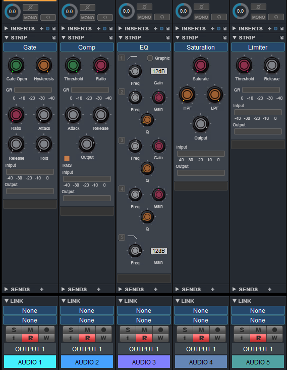 AUDIOトラックの各チャンネルストリップには、基本の音作りに欠かせないGate、Comp、EQ、Saturation、Limiterの5種類のエフェクトをSTRIPエフェクトとしてビルトイン。