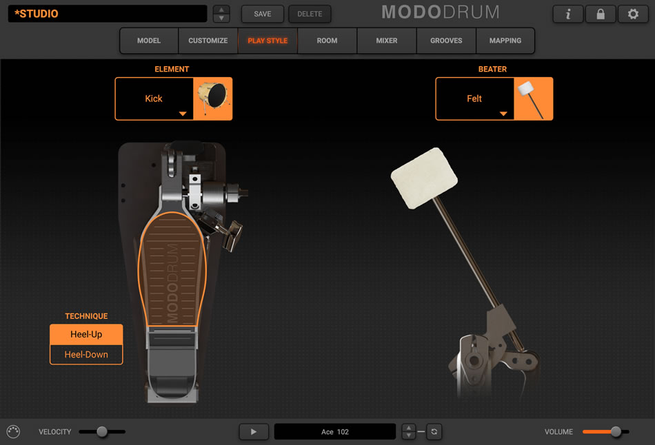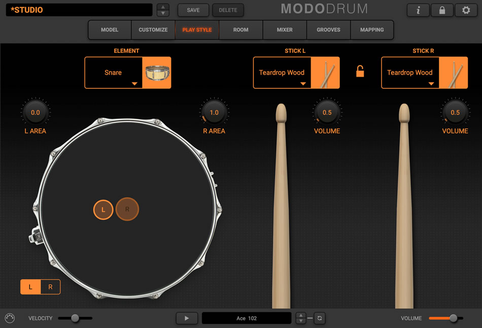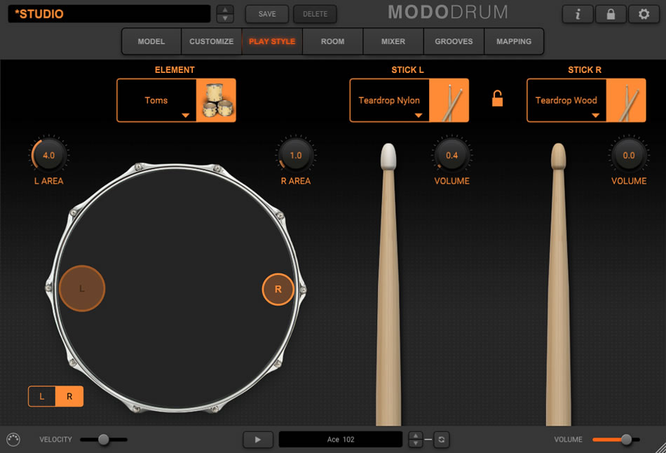 - ドラム・サウンド全体をコントロール可能:ドラム・キット、演奏スタイル、スティック、部屋鳴り、エフェクト