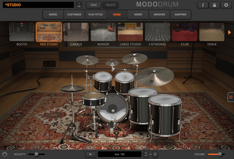 ROOMセクションでは、ドライなブースからIK Multimediaの高品位な自社レコーディング・スタジオ、さらにはガレージや大聖堂まで、さまざまな場所にドラム・キットを設置できます。
