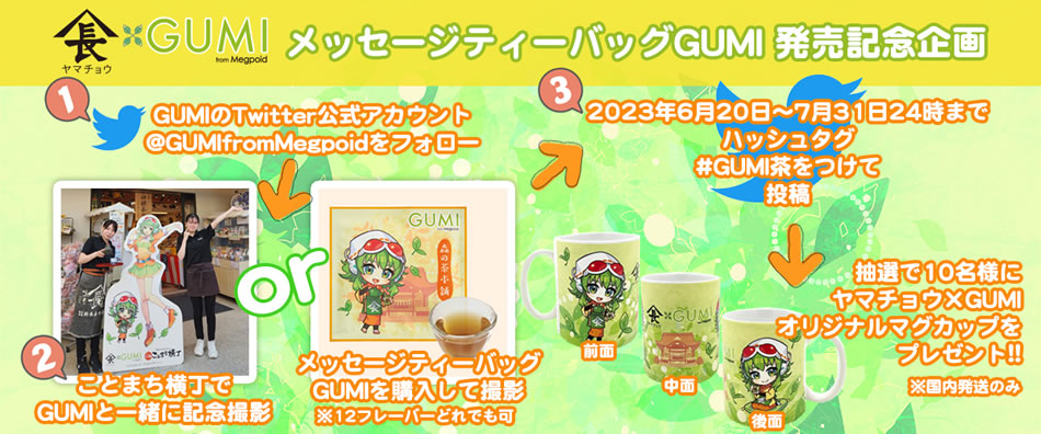 投稿していただいた方の中から抽選で、メッセージティーバッグGUMIのパッケージに登場している「ヤマチョウ×GUMIのキャラクター入りオリジナルマグカップ」を抽選で10名様にプレゼントします!