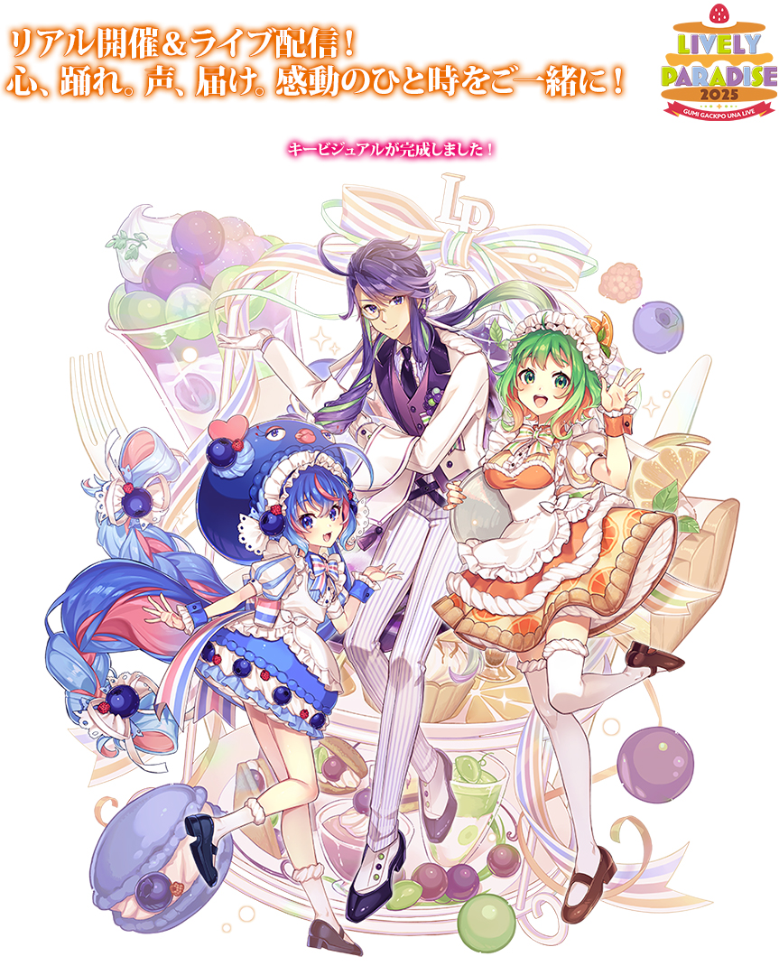 昨年開催した公式ライブ『GUMI がくぽ ウナ 誕生祭ライブ Lively Paradise 2024』。今年はスイーツをテーマにしたGUMI、神威がくぽ、音街ウナの3人による3Dライブステージ『Lively Paradise 2025』の開催を予定し、制作プロジェクトのクラウドファンディングを実施中です。