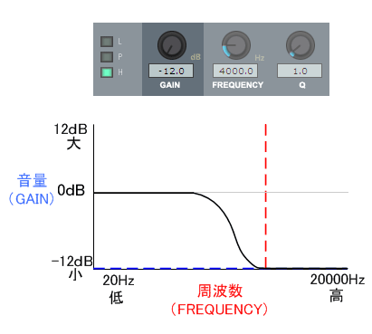 ハイシェルビングイコライザは[4]フリケンシーで設定した周波数以上の音量を[5]ゲインのつまみによって上げ下げします。主に高音を増幅/低減するために使用します。