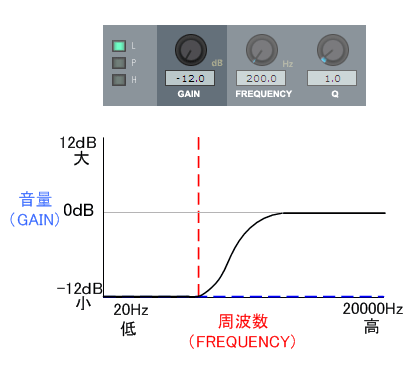 フリケンシー値を上下させることで、音量を上げ下げする周波数の境界を設定することができます。