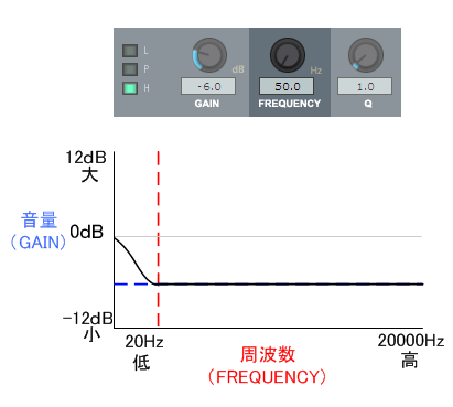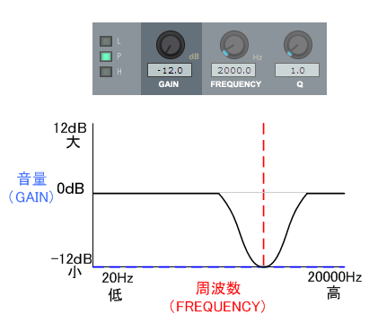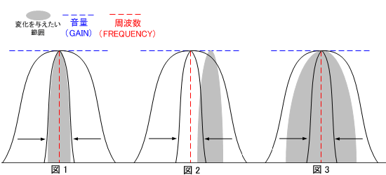 フリケンシー値を上下させることで、音量を上げ下げする周波数帯の中心を設定することができます。