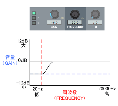 ローシェルビングイコライザは、[4]フリケンシーで設定した周波数以下の音量を[5]ゲインのつまみによって上げ下げします。主に低音を増幅/低減するために使用します。
