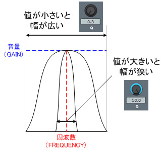 - ピーキングイコライザでQを調整した場合のイメージ図