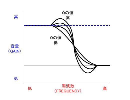 - ローシェルビングイコライザでQを調整した場合のイメージ図