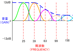ひとつひとつのつまみは、左下図のように山のような形をしており、隣の山と重なり合うようになっていますが、重なった部分のGAINを足すと山と山の間が滑らかにつながり、右下図のグラフィックイコライザのGAINとよく似た形になることが分かります。