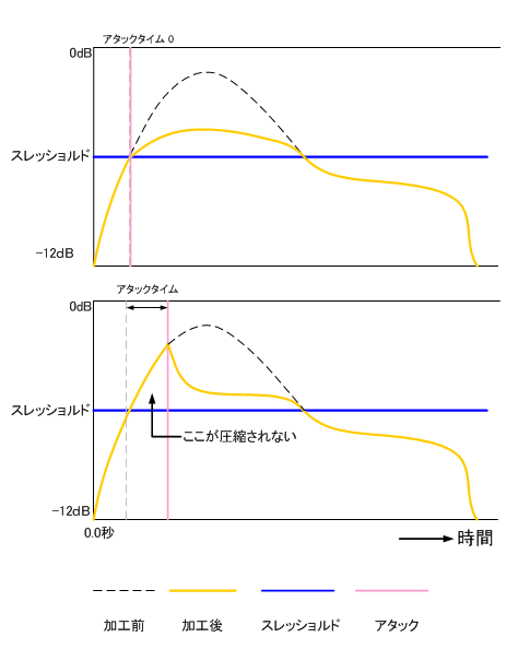 スレッショルドを超えた地点から圧縮をかけるまでの時間を設定します。アタックタイムを設定すると最初の部分が圧縮されない為、アタックの強い音づくりが可能です。