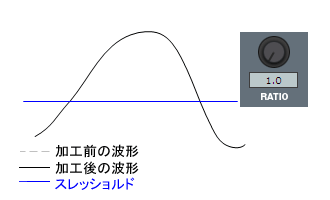 コンプレッサーでレシオの値を上げると、圧縮対象範囲に対する圧縮率が上がります。