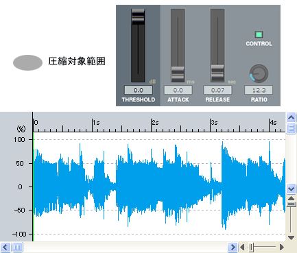 コンプレッサーでスレッショルドを上下させることで、圧縮の対象となる範囲を設定することができます。
