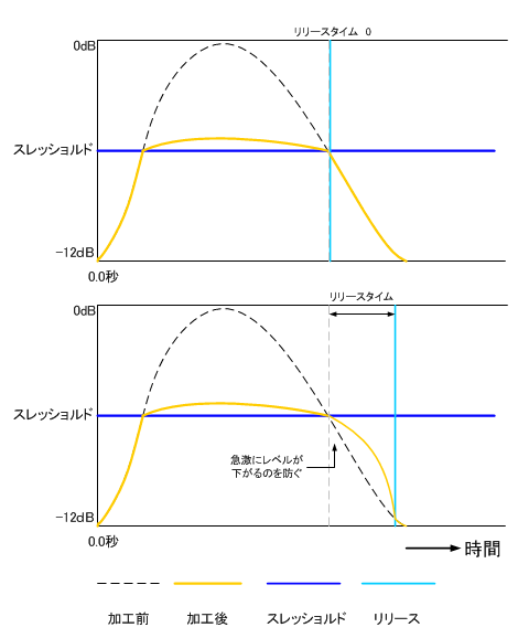 スレッショルドを超えた地点から圧縮をかけはじめるまでの時間を設定します。リリースを設定すると最後の部分の相対的な音量が上がり、音が伸びたように感じます。