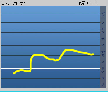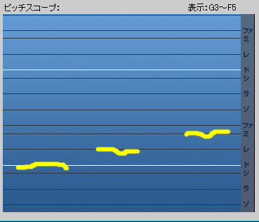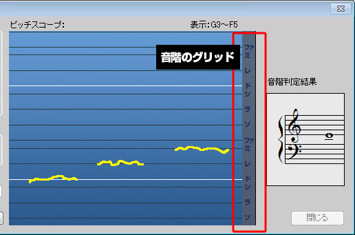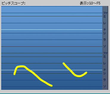 ピッチスコープには音階のグリッドがあらかじめ引かれています。また、入力された声の高さが黄色(または水色)の線で表示されます。この線ができるだけ水平線に近く、目的音のグリッドに近い方が鼻歌入力機能に適した歌い方になります。