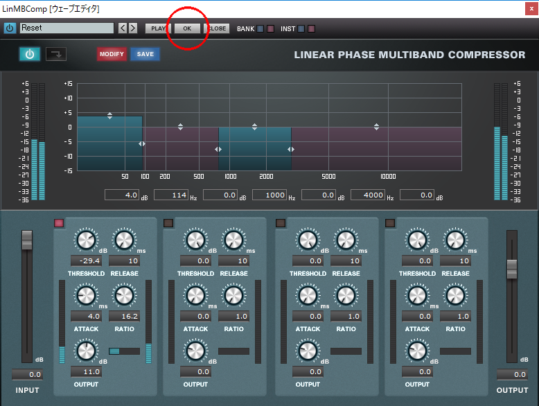 Linear Phase Multiband Compressor(リニアフェイズ マルチバンド コンプレッサー)は、ロー(低域)、ローミッド(低中域)、ハイミッド(高中域)、ハイ(高域)の4つの帯域に分割する際、周波数による位相歪が発生しないのが特長で、各帯域でそれぞれ違った設定のコンプレッサーをかけることができます。特定の楽器、例えば、ドラム楽器のハイハットやバスドラムなど、特定の音域で鳴る楽器音に対して、コンプレッサーをかけたい場合などに効果的です。