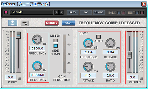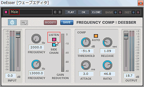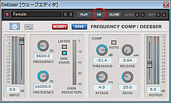 3.エフェクターに「DeEsser」を設定します。 4.各コントロールのスライダー/ノブを、お好みに合わせて調整/PLAY(試聴)を繰り返して、データに合う値を決めてください。 |