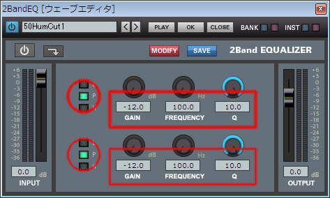 「イコライザ」を使用して、50Hz(東日本)/60Hz(西日本)のゲインを下げることもできます。