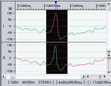 波形拡大時にノイズの位置を見失ってしまう場合は、こちらを参照して下さい。 - ノイズの入っている部分は例えば図1のように波形が飛び出したりしています。その区間が微小な場合は、範囲選択して消去するか、削除して下さい。