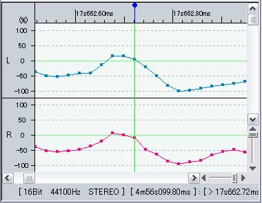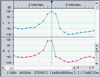 波形拡大時にノイズの位置を見失ってしまう場合は、こちらを参照して下さい。 - サンプル単位で修正しますので、図3のようにサンプル点が表示されるまで拡大します。