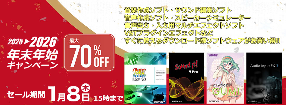 音楽作成・サウンド編集・音声入力用マルチエフェクトソフト(Audio Input FX 3)・音声出力用マルチエフェクト(PC Audio FX)・プラグインエフェクト(MS EQ COMP・F-REX・V MONITORなど)などを最大70%OFFのスペシャル価格でご提供。