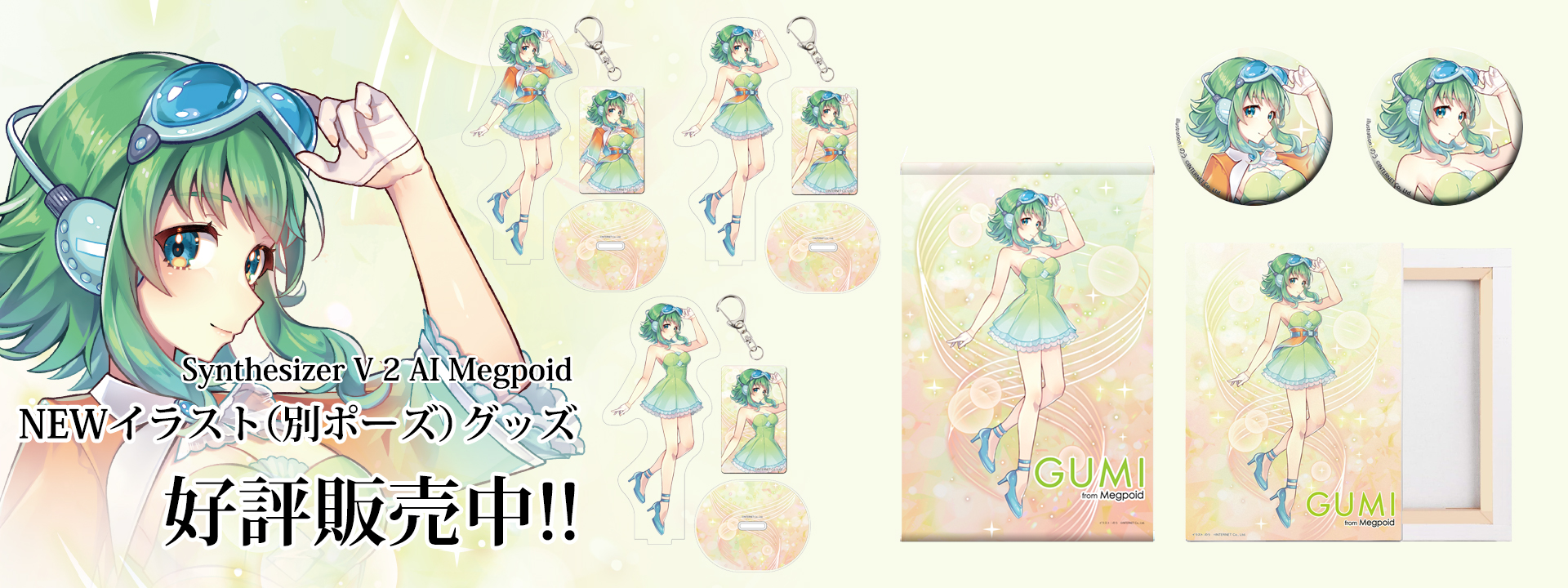 Synthesizer V 2 AI Megpoid 「GUMI」新イラスト(別ポーズ)の15cmアクリルスタンド&アクリルキーホルダー、缶バッジ、タペストリー、イラストボードが登場です。