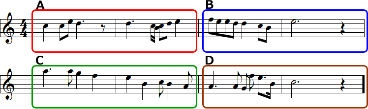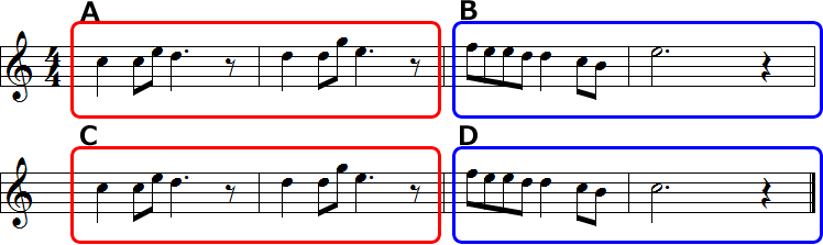 こちらはAとC、BとDがそれぞれ同じような音符の動き方をしています。