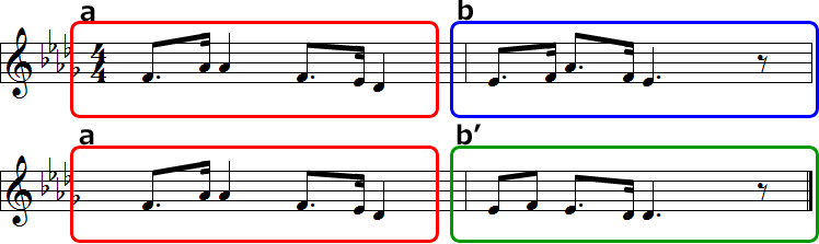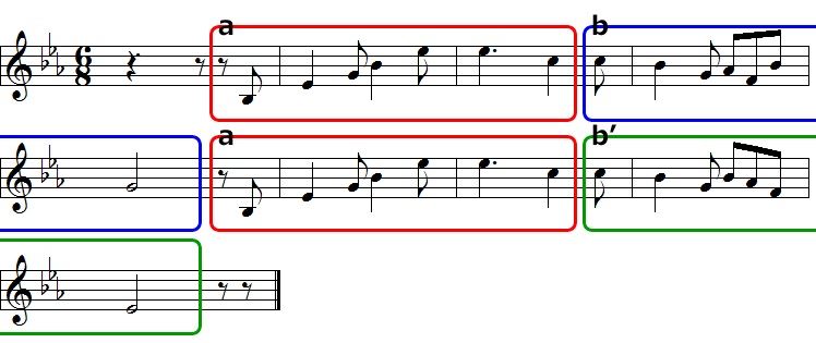 これは6/8拍子ですが、やはり同じようにa-b-a-b'です。