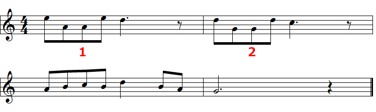 - 4小節は2小節目とモチーフ的にはほぼ同一系統ですが、音程とリズムが微妙に異なります。