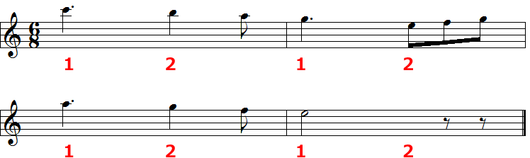 このように6拍子は「音符3つで1拍」の形が2つまとまったものです。