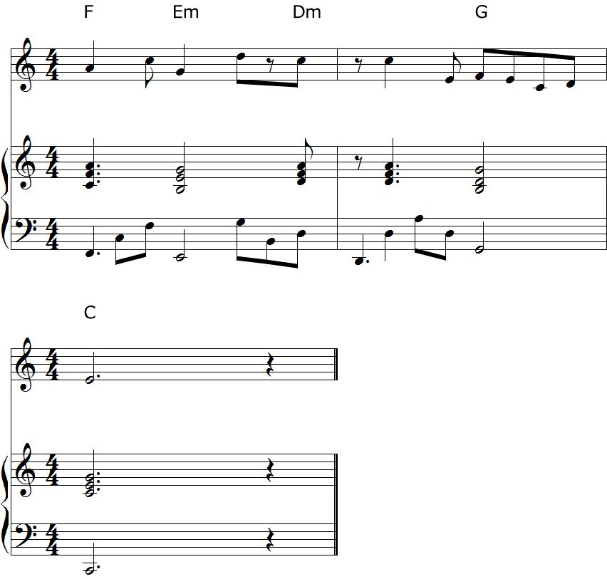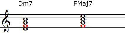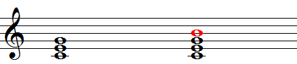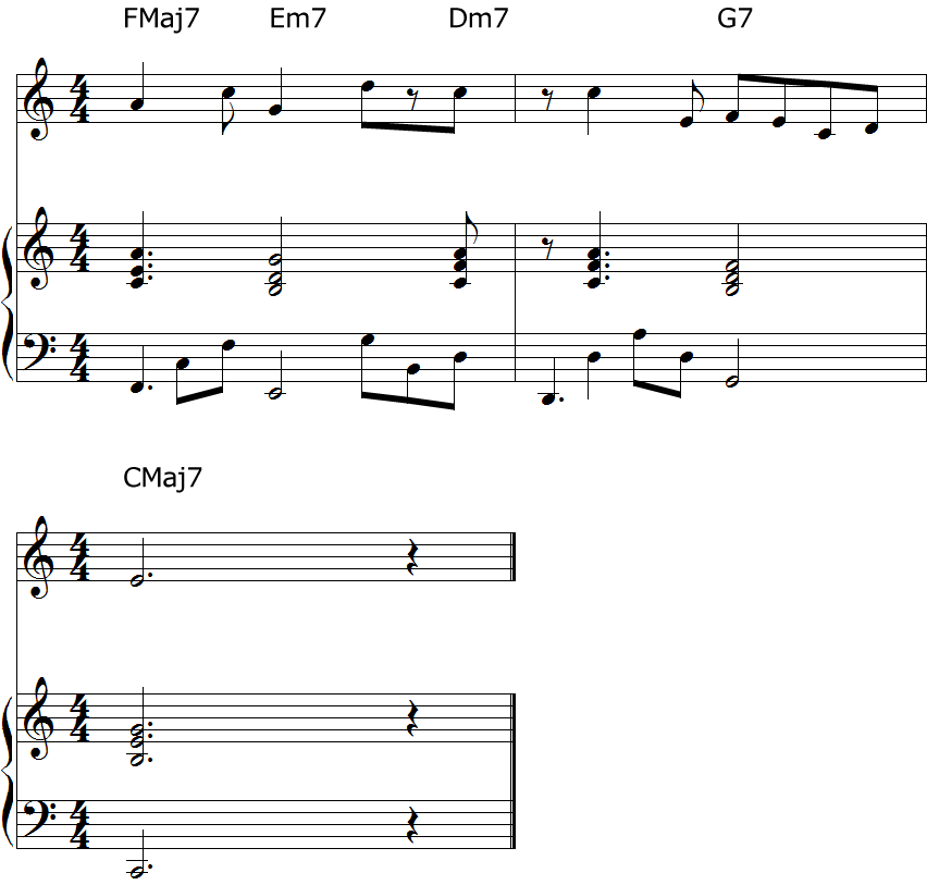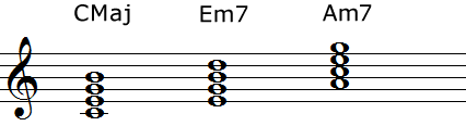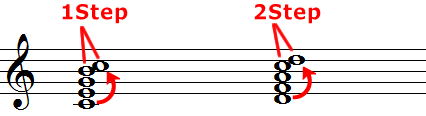 最初のコード進行は三声のダイアトニックによるコード進行です。2つ目は四声にしたもの。