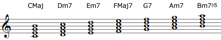 ダイアトニック・スケールをひとつ置きに積んで“三段積み”になっているのがこれまでも扱ってきた「トライアド」ですが、セブンスコードはこれにさらにもう一段積んだコードになります。