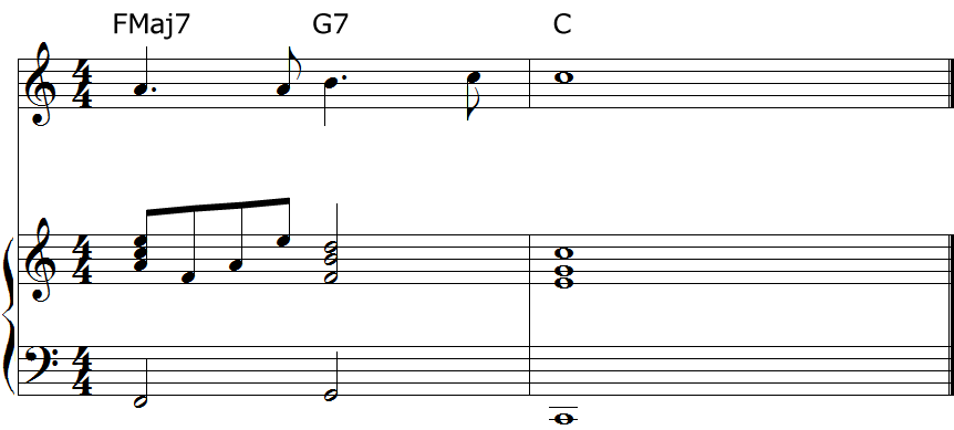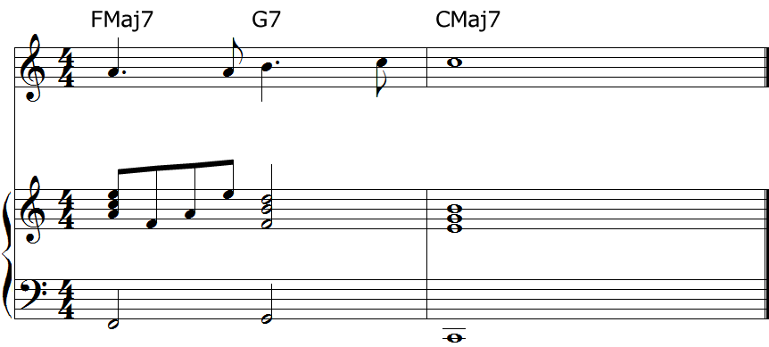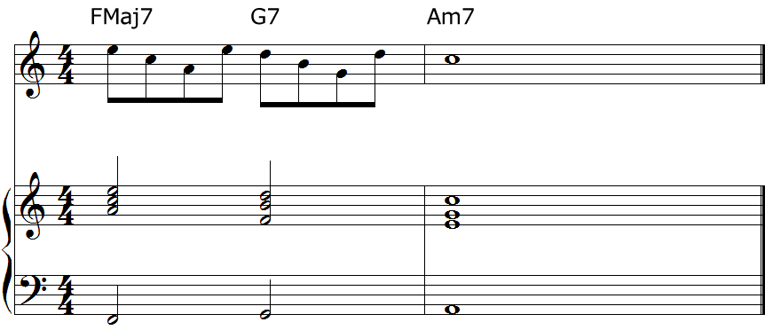 「ミ」はFMaj7のコードトーンでもあるので使ってみます・・・