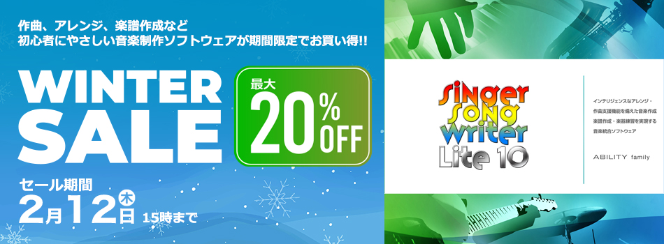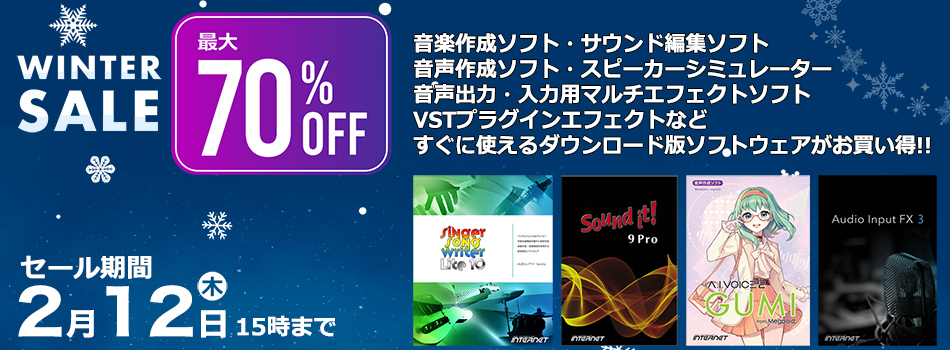 音楽作成ソフト、サウンド編集ソフト、音声作成ソフト(キャンペーン対象外)、音声入力・出力用マルチエフェクトソフト、スピーカーシミュレーター、VSTプラグインエフェクトなど、すぐに使えるダウンロード版を最大70%OFFのスペシャル価格でご提供いたします!!