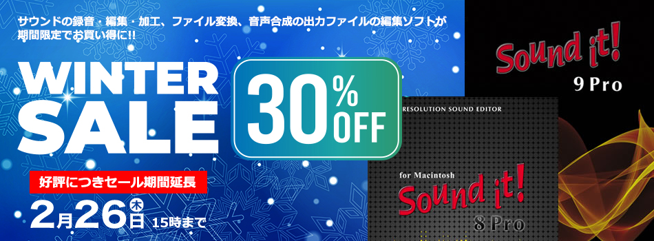 音楽作成ソフト、サウンド編集ソフト、音声作成ソフト(キャンペーン対象外)、音声入力・出力用マルチエフェクトソフト、スピーカーシミュレーター、VSTプラグインエフェクトなど、すぐに使えるダウンロード版を最大70%OFFのスペシャル価格でご提供いたします!!