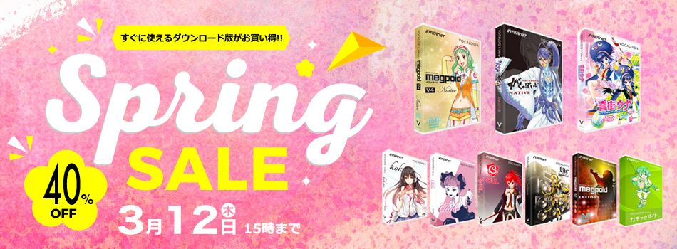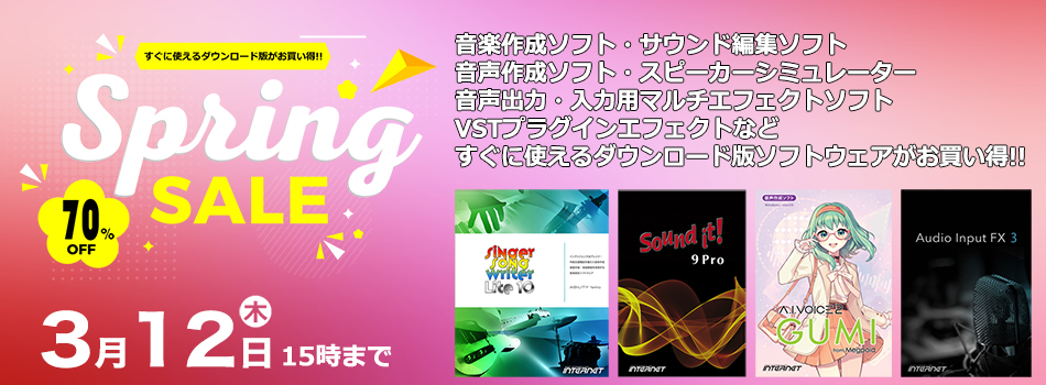 音楽作成ソフト、サウンド編集ソフト、音声作成ソフト(キャンペーン対象外)、音声入力・出力用マルチエフェクトソフト、スピーカーシミュレーター、VSTプラグインエフェクトなど、すぐに使えるダウンロード版を最大70%OFFのスペシャル価格でご提供いたします!!