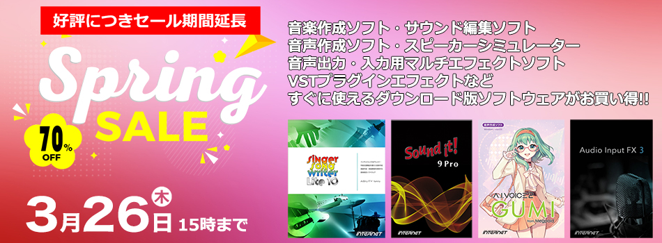 音楽作成ソフト、サウンド編集ソフト、音声作成ソフト(キャンペーン対象外)、音声入力・出力用マルチエフェクトソフト、スピーカーシミュレーター、VSTプラグインエフェクトなど、すぐに使えるダウンロード版を最大70%OFFのスペシャル価格でご提供いたします!!