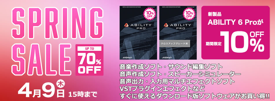 音楽作成ソフト、サウンド編集ソフト、音声作成ソフト(キャンペーン対象外)、音声入力・出力用マルチエフェクトソフト、スピーカーシミュレーター、VSTプラグインエフェクトなど、すぐに使えるダウンロード版を最大70%OFFのスペシャル価格でご提供いたします!!