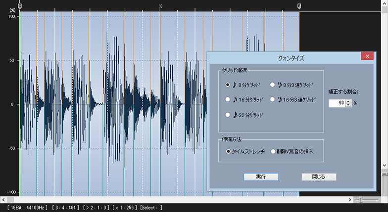 クオンタイズ機能は、ジャストなタイミングや自然なニュアンスを残しながらなど、発音タイミングの補正が簡単に行え、素材や状況に合わせ、タイムストレッチや削除/無音部を追加してのクオンタイズを選択できます。