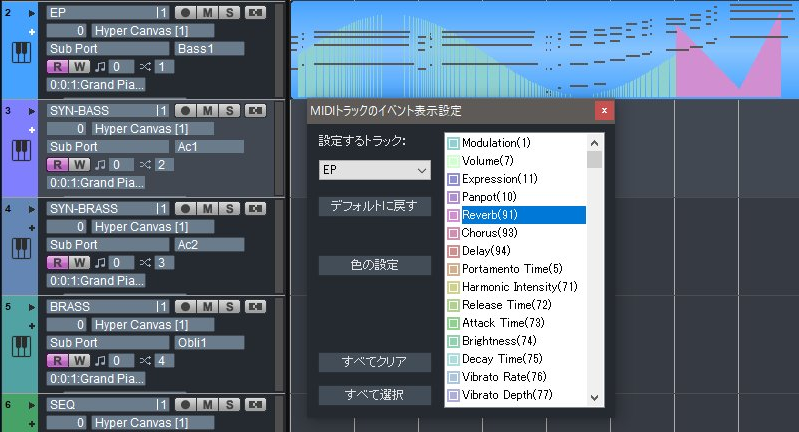 MIDIトラックは、コントロールごとに設定した色でコントロールを同時表示可能。