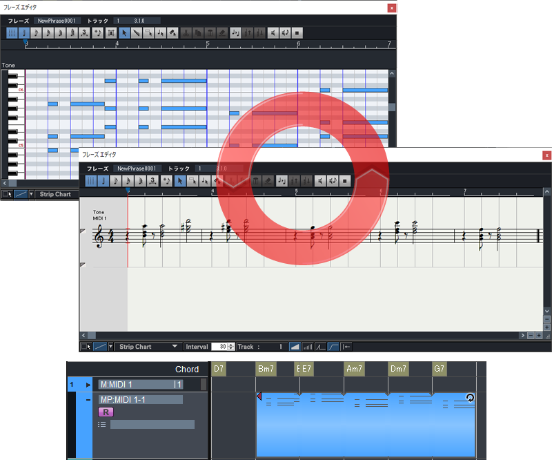 展開後のデータは、スコアやピアノロールの2種類の形式を備えるフレーズエディタで編集可能。