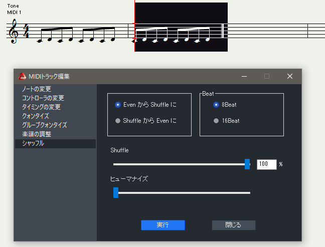 選択した音符データ(演奏データ)のリズムをシャッフルやイーブンに変更可能。