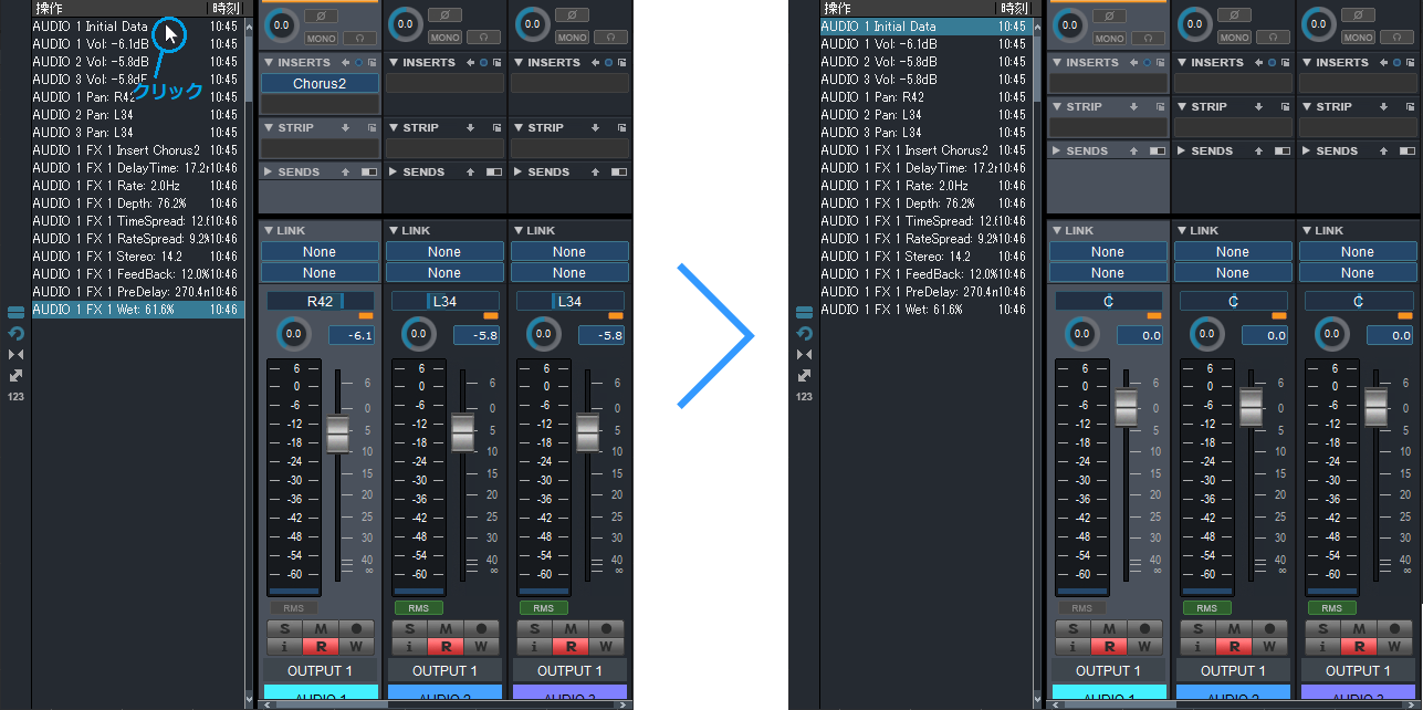 ミキサー操作とインサーションエフェクトに割り当てた各エフェクトのパラメータ変更に至るまで、最大100履歴までの操作・設定を記憶しUNDO / REDOが可能。
